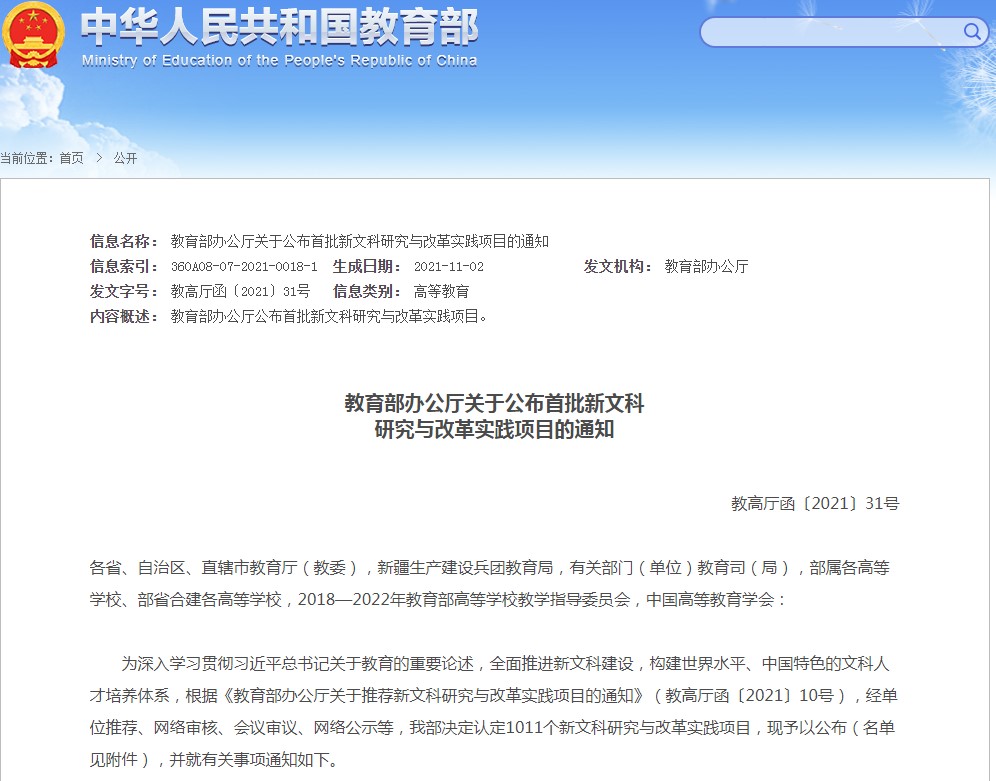 据悉,新文科是教育部推进的“四新”(新工科、新医科、新农科、新文科)建设之一,新文科研究与改革实践项目是教育部办公厅为深入学习贯彻习近平新时代中国特色社会主义思想,贯彻落实全国教育大会精神,落实新文科建设工作会议要求,全面推进新文科建设,构建世界水平、中国特色的文科人才培养体系的一项重要举措。