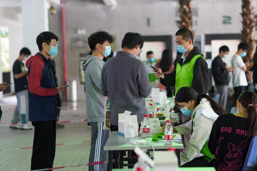 在核酸检测采样工作的现场,能看到许多身穿绿色马甲和红色马甲的志愿者,他们为师生测量体温、引导师生有序排队,为核酸检测工作的顺利进行提供坚实保障。