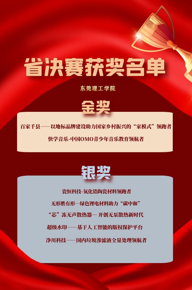 8月11日,第七届中国国际“互联网+”大学生创新创业大赛省广东省分决赛(以下简称“省决赛")圆满落下帷幕。莞工学子在比赛中奋勇争先,斩获双金五银,金银奖数量再创新高。其中《快学音乐——中国OMO青少年音乐教育领航者》《百家千县——以地标品牌建设助理国家乡村振兴的“家模式”领跑者》分别荣获高教主赛道和“青年红色筑梦之旅”赛道金奖。