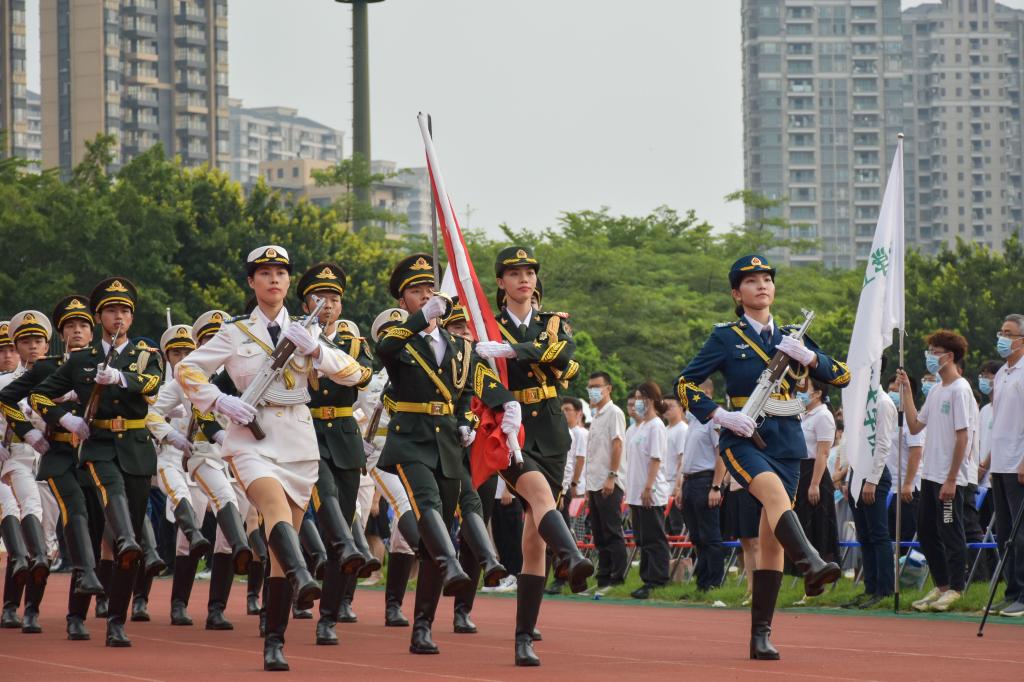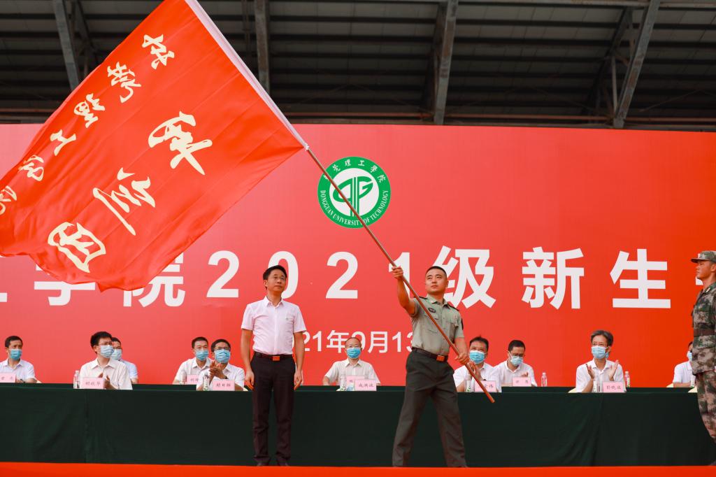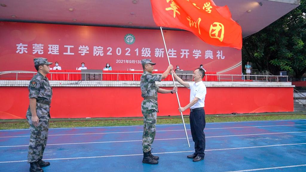 开学典礼后举行军训动员大会,成洪波、李忠红为军训团授旗,标志着2021级新生军训正式开始。