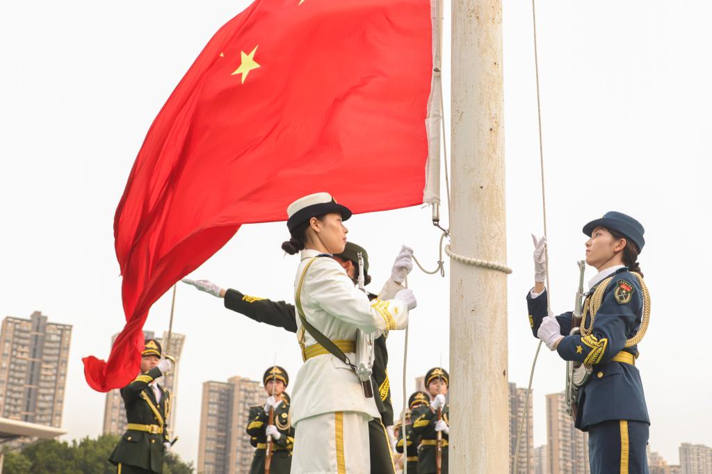 在铿锵有力的口令下,国旗护卫队队员们迈着整齐划一的步伐护送国旗入场。鲜艳的五星红旗伴随着庄严的国歌缓缓升起,全体师生向国旗行注目礼,唱国歌。