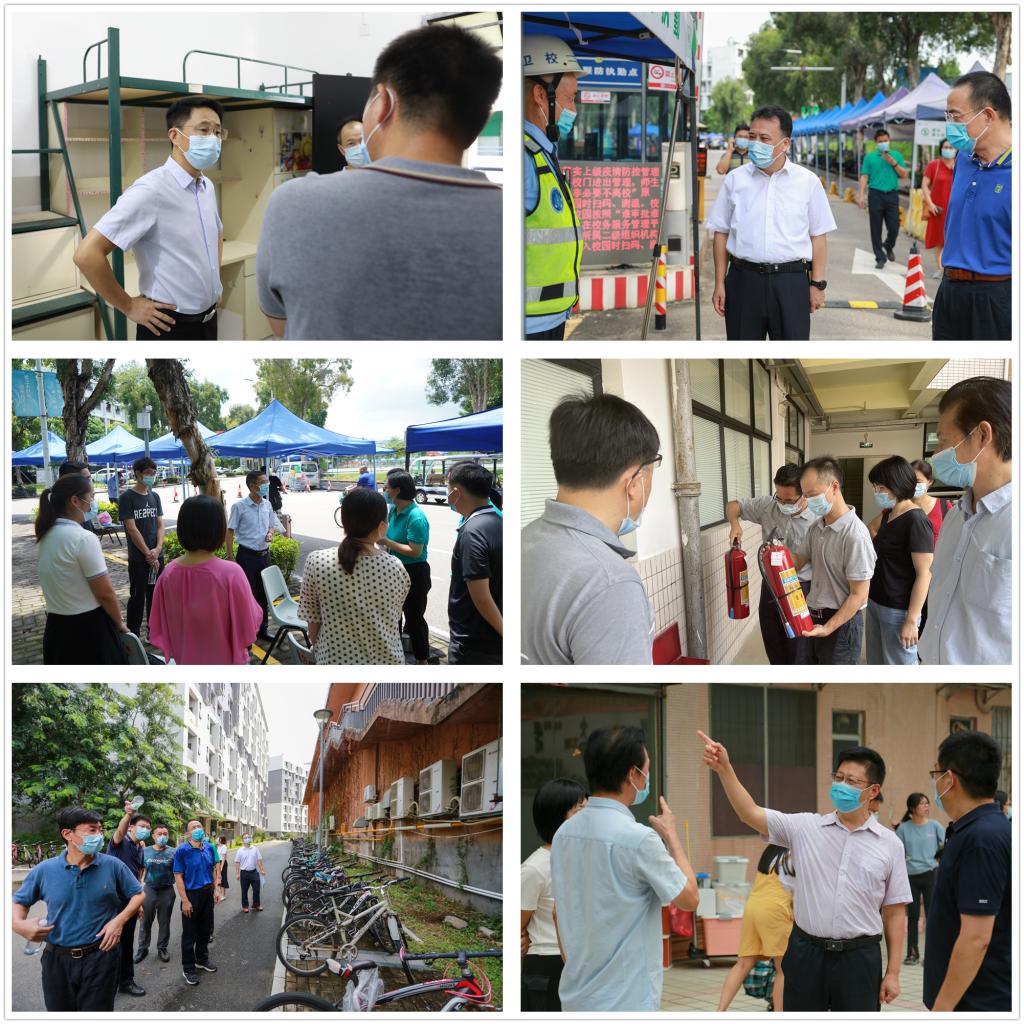 校领导成洪波、马宏伟、赖日辉、李忠红、杨敏林、李文芳分别到两校区检查指导学生返校工作。校领导仔细了解学生返校情况以及核酸检测安排等,并对学校食堂的消毒清洁工作、菜品供应情况和学生就餐安排提出相关要求;校领导还到宿舍区了解学生工作、学习情况以及宿舍安全管理,并欢迎莞工学子的平安归来。