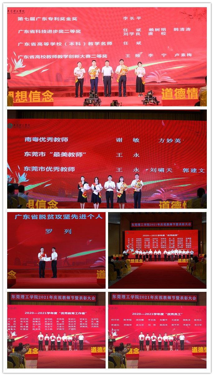 2020-2021学年度,学校广大教师立足岗位,兢兢业业、教书育人,涌现出一大批好老师。学校对他们进行了隆重表彰致贺,激励和引导教职工向先进学习,不断作出新的更大贡献。其中,开云驻应山村第一书记罗列被省委省政府授予“广东省脱贫攻坚先进个人”荣誉称号;李长平获得第七届广东专利奖金奖;任斌获评为广东省高等学校(本科)教学名师;谢敏、方妙英等2名教师被评为“南粤优秀教师”;任斌、赖树明、韩清涛、刘学良、唐校获得广东省科技进步奖二等奖;王频、李宁、卢素梅获得广东省高校教师教学创新大赛二等奖;王永老师被评为“2021年东莞市‘最美教师’”;王永、刘啸天、郭建文等3名老师教师被评为“2021年东莞市优秀教师”。105位教师分别获得了2021-2021学年度“优秀教师”“优秀教育工作”“优秀员工”的称号。