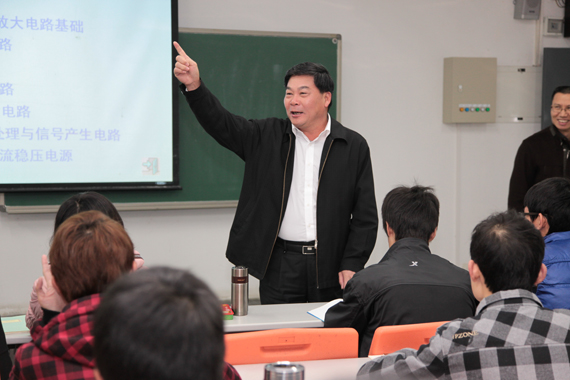 在2011年首批招收的电子信息工程专业“卓越计划班”里,周致纳、杨晓西了解了同学们的学习情况。周致纳还即兴出题考了同学们。