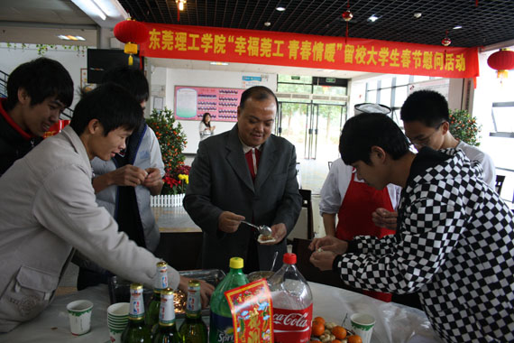 据悉,为了让留校大学生过好年,学校各相关部门积极配合上级有关单位要求,及早筹备,认真细致开展“幸福莞工 青春情暖”系列活动,安排了勤工助学岗位、做好后勤安全保障、开展安全心理教育、做好春节慰问活动和安排除夕免费晚餐等,力图让留校学生寒假过得充实、过得愉快。