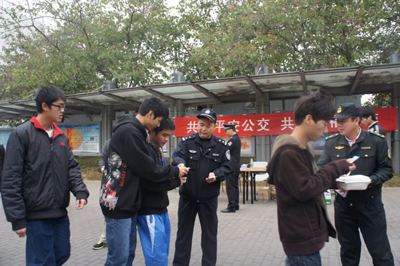 1月4日,保卫处联合松山湖公安分局、交通分局在一期饭堂前举行了以“平安公交,幸福莞工”为主题的送平安进校园宣传活动。
