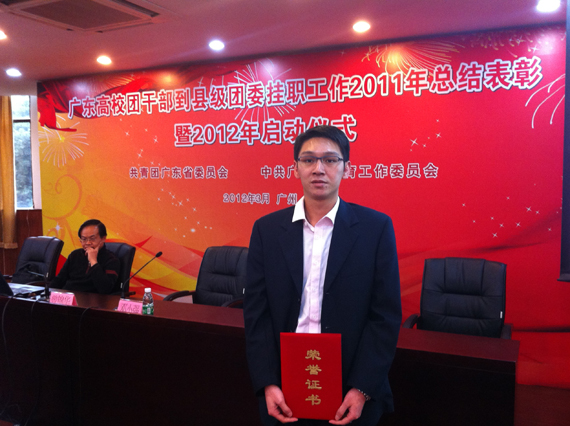3月9日,广东高校共青团干部到县级团委挂职工作2011年总结表彰暨2012年启动仪式在暨南大学学术报告厅举行。 团省委副书记陈宏宇,暨南大学党委副书记叶勤等领导同志出席了活动,并向受表彰的2011年优秀挂职团干部标兵颁了奖。 因在2011年挂职锻炼中表现优异,开云外语系翁炎泉老师被授予“优秀挂职干部标兵”称号。此前,翁炎泉老师已在汕尾市荣获2011年优秀团干部的光荣称号。