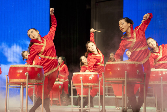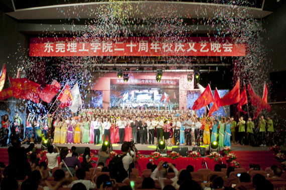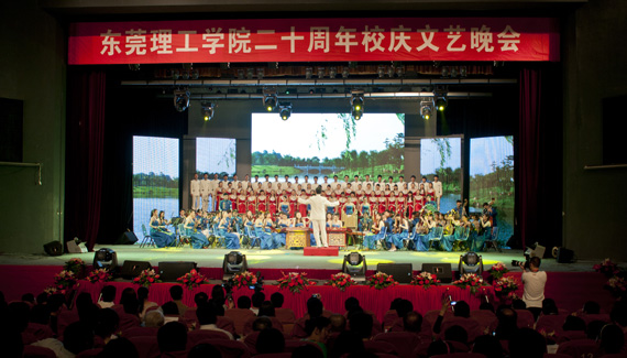 晚会在气势如虹的鼓声中拉开了序幕,时尚动感的民族鼓表演,20位身穿红色服装的舞者,20个民族大鼓,再加上背景视频出现的太阳、海浪、天空、校园和雄鹰等景物的转换,让人联想到莞工20年的奋斗换来今天的辉煌成就。歌舞《青春的旋律》由24位青春靓丽的女生伴舞,利落的表演、欢快的节奏,无不洋溢着青春的激情与活力。《童年》、《校园的早晨》、《光阴的故事》、《同桌的你》、《我是女生》以及《青春舞曲》等校园民谣连唱,