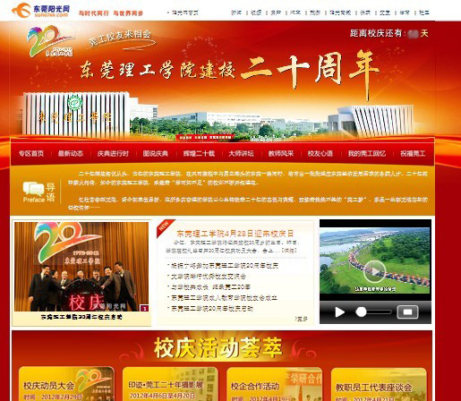 网站页面设计以红色调为主,体现了20周年校庆喜庆热烈的气氛。网站设置有最新动态、校庆活动荟萃、庆典进行时、图说庆典、辉煌二十载、建校20周年纪念画册、大师讲坛、教师风采、校友心语、我的莞工回忆、饮水思源念莞工、祝福莞工等栏目。其中,即将推出的建校20周年纪念画册将以电子杂志形式展现,可供网友下载欣赏;而我的莞工回忆、饮水思源念莞工、祝福莞工则为互动栏目。