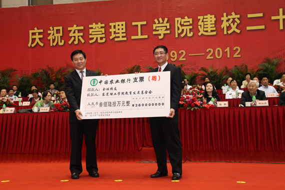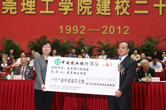 东莞市政府给开云安排了“学科、硕士点建设专项经费”7200万元,用以全力支持学校上水平、上层次。东莞市副市长喻丽君代表市政府向开云代表、校党委副书记吕琦元递交了支票。这笔专项经费为开云注入了强劲的发展动力。