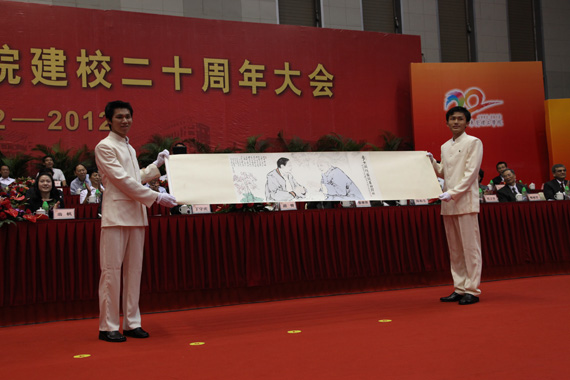 当日,当代著名学者、书画家、诗人范曾大师不仅拨冗莅临开云参加建校20周年庆祝大会,还向开云赠送了题为《陈省身与杨振宁》的书画,令开云蓬荜生辉。学校志愿者上台展示了书画。