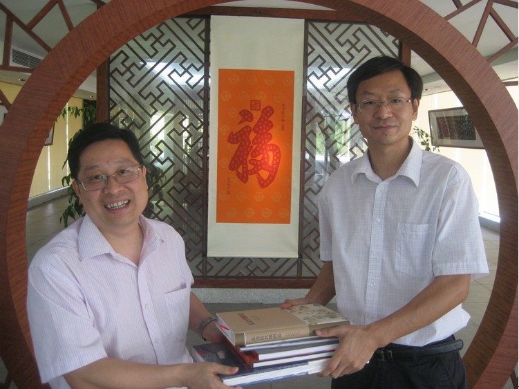 双方在翰墨堂举行了地方文献赠书仪式,李炳球代表市政协向地方历史文化研究文献室赠送了《东莞历代地图集》、《东莞音字典》、《东莞影像》、《翰墨东莞》等一批新出地方文献。