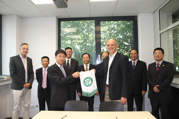 校党委书记成洪波向斯宾纳机床设备公司总裁Nicolaus SPINNER赠送校旗