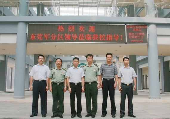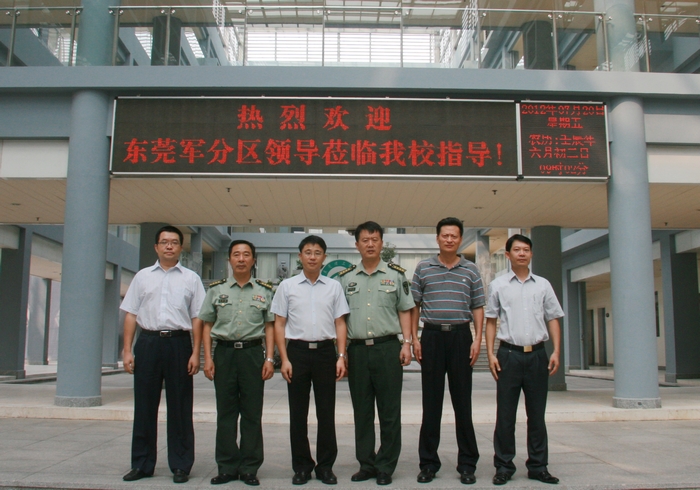 7 月 20 日 上午,东莞军分区司令员李庆文大校、参谋长黄汉光上校莅校交流指导工作。学校党委书记成洪波、副校长戴炳源和学校相关职能部门负责人热情接待了李司令员一行,并进行了座谈。