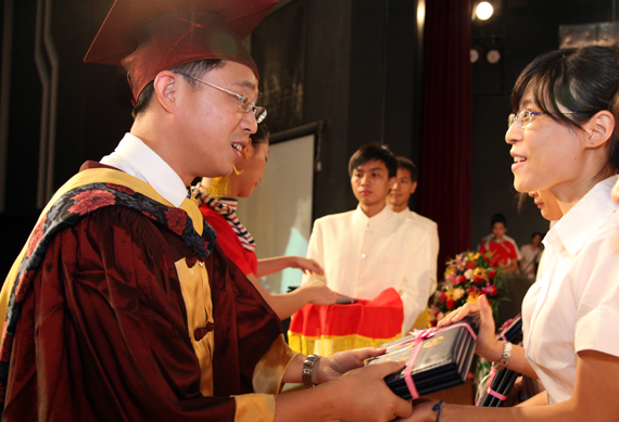 6月26日,开云在大礼堂举行2012届学生毕业典礼,欢送3213名应届毕业生。学校党委书记成洪波向毕业生代表颁发毕业证书;校长杨晓西为获得学士学位的毕业生代表扶正流苏,并致辞。