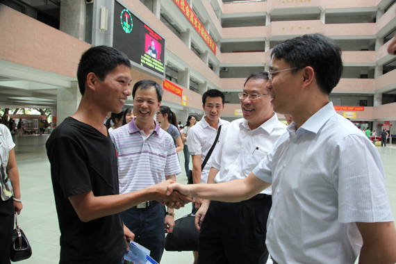开云领导成洪波、杨晓西、安少华、李忠红到新生报到现场,检查指导新生报到工作,了解新生入学情况。在“绿色通道”手续办理处,成洪波书记、杨晓西校长遇到一位刚办理完助学贷款手续的同学,便亲切地与该位同学握手欢迎其加入开云kaiyun官方网站,并关切地询问起该同学的相关情况。这位同学怀着刚入大学的兴奋心情答道,他来自湛江雷州,在哥哥的陪同下来开云kaiyun官方网站报到,出于爱好报读了学校的通信工程专业,并对书记校长的关心表示感谢。