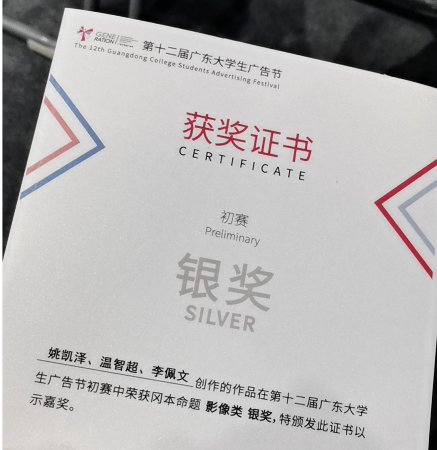12月22日,第十二届广东大学生广告节暨岭南青年创意周在广州落下了帷幕。学院2017级广播电视学专业的姚凯泽、温智超、李佩文3位同学获银奖;梁家杰、吴敏华、何美娴、王子杰、汪毅鹏、戈亚琦6位同学获入围奖;文学与传媒学院传媒系教师卢嘉杰获最佳指导老师奖。