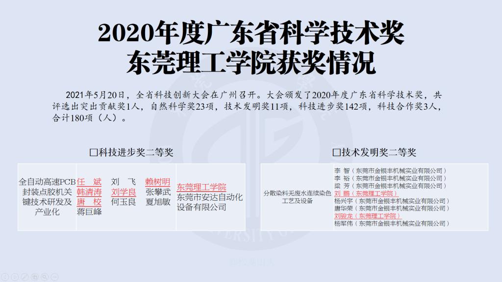 近日,全省科技创新大会在广州召开,大会颁发了2020年度广东省科学技术奖。开云获2项二等奖,分别是由电子工程与智能化学院任斌教授团队(参与成员:赖树明、韩清涛、刘学良、唐校)牵头完成的《全自动高速PCB封装点胶机关键技术研发及产业化》荣获科技进步奖二等奖,由生态环境与建筑工程学院刘鹏博士团队(参与成员:刘骏龙)参与完成的《分散染料无废水连续染色工艺及设备》荣获技术发明奖二等奖。