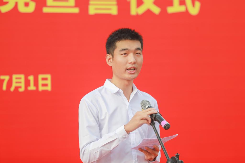 生态环境与建筑工程学院2020级资源与环境专业研究生朱立福作为预备党员在国旗下发言。100年来,在中国共产党的领导下,国家的政治地位、经济实力以及军事力量发生了翻天覆地的变化,由一个贫穷落后的国家发展成如今的世界第二大经济强国,屹立于世界民族之林!朱立福,作为一名预备党员要勇于肩负起时代赋予的重任,不忘为中国人民谋幸福的初心,牢记为中华民族谋复兴的使命!
