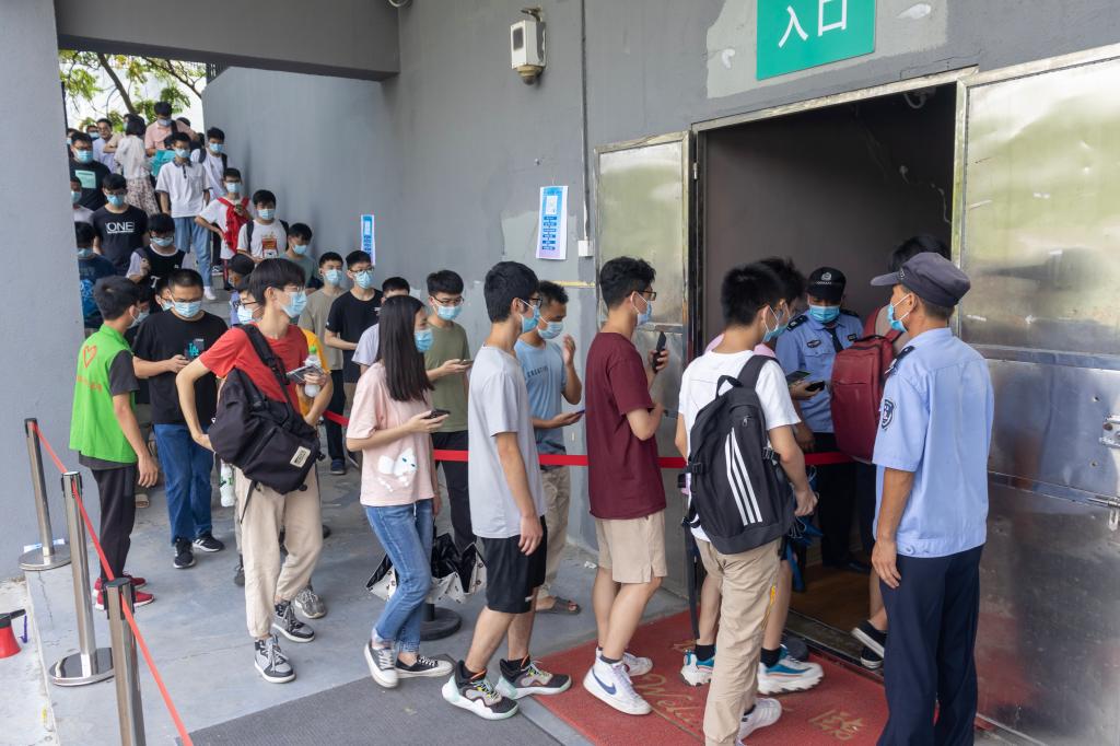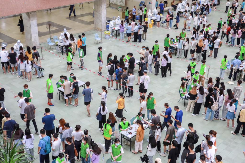 作为核酸检测采样工作的志愿者,2017级粤台产业科技学院的张同学和现场的工作人员一起维持长长队伍的秩序。在几个小时的忙碌后,核酸检测采样的长龙也慢慢地缩短,她才有空到隔壁的石凳下休息。“其实我们不算累了,医护人员身着防护服顶着30度的高温坚持工作,相比之下我们这些工作量不算什么。”