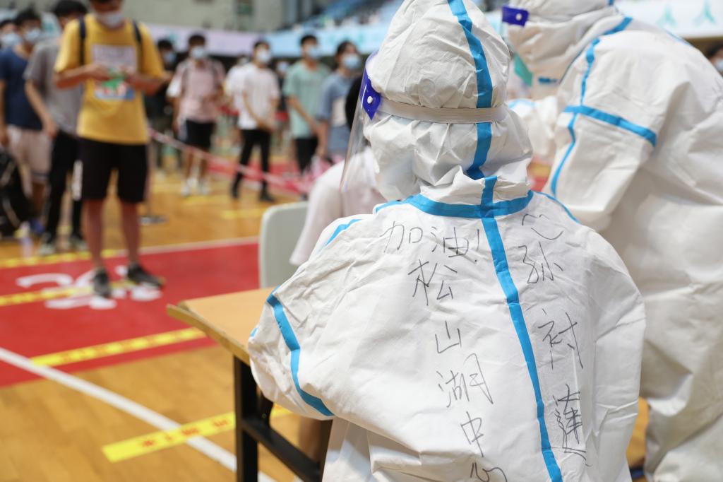 本次学校两校区核酸检测采样工作中,莞城校区由东莞市莞城医院派出20多位医护人员完成核酸检测采样工作,松山湖校区由松山湖中心医院派出33位医护人员完成核酸检测采样工作。他们在厚重的防护服下持续工作三到四个小时后才作一次轮班,进行短暂的休憩与水分补充。