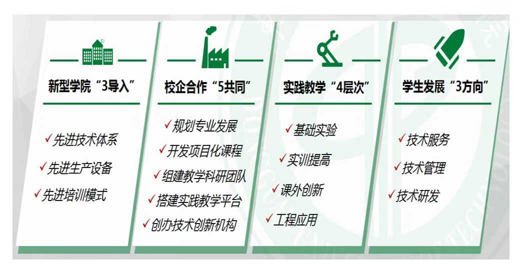学校自2012年起,将现代产业学院建设作为高等工程教育改革的突破口,鼓励创新合作与机制改革,推进现代产业学院制度建设、构建校企协同育人的“双结构型”师资队伍、实施企业资源三导入、专业建设五共同、实践教学四层次、学生发展三方向的“三五四三”产教协同育人模式,成效显著,社会影响广泛,获2018年国家教学成果奖二等奖1项,省级教学成果奖6项,2个产业学院获批教育部现代产业学院,5个现代产业学院获批为省级示范性产业学院。以文工交叉型产教融合型课程群建设为重点,迭代现代产业学院建设,建成10门产教融合型课程群。