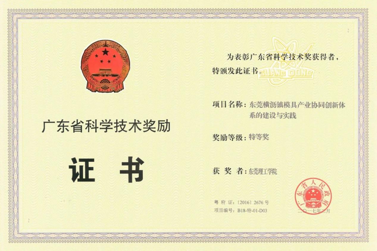 与横沥镇共建3D打印公共服务中心和模具检测技术中心,形成全国校地协同创新“横沥经验”,合作成果“东莞横沥镇模具产业协同创新体系的建设与实践”获广东省科学技术奖特等奖。