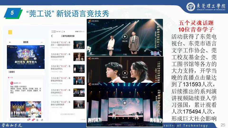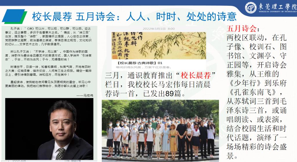 课堂外,通识教育中心开展了常规性品牌活动:求是读书计划、通识教育大讲堂和校级金牌活动——“莞工说”新锐语言竞技秀和五月诗会。许燕转强调,活动设计的总体宗旨有三:一是推动学生综合能力的可视化发展;二是倡导人人、时时、处处的通识理念;三是推广新媒介环境下的通识普及模式。