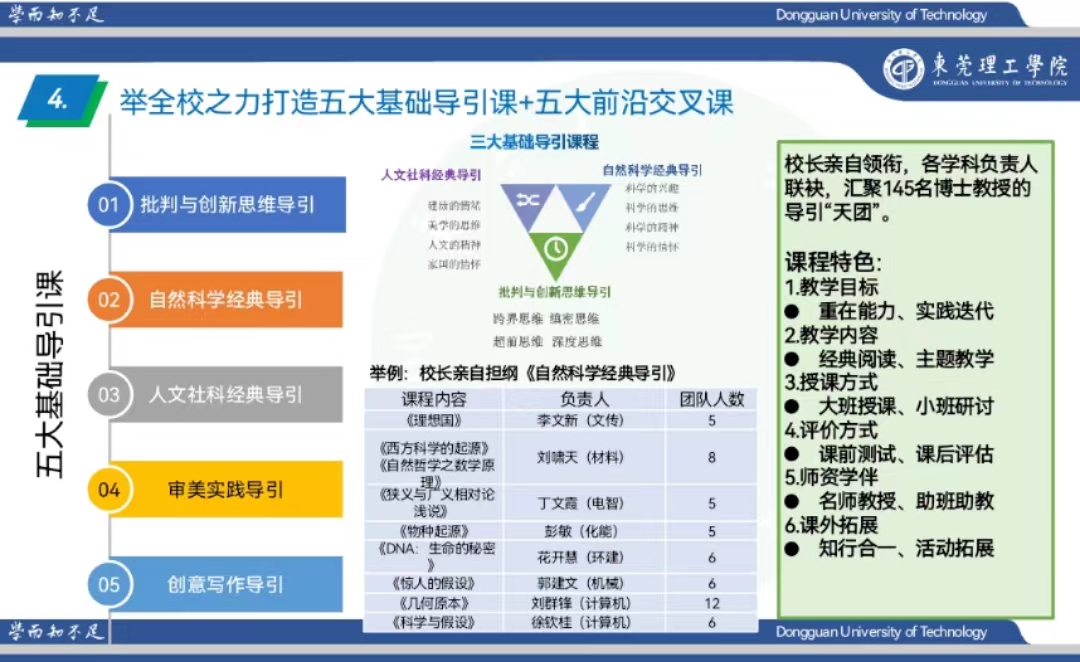 从2014年起,学校便针对通识教育布局谋划,经过不断完善后,在2021年将此项改革项目落地:出台改革方案,确定莞工通识教育培养目标,成立第一届通识教育委员会,由校长马宏伟任委员会主任;成立通识教育中心,任命7位模块建设组长,35位课程单元负责人。
