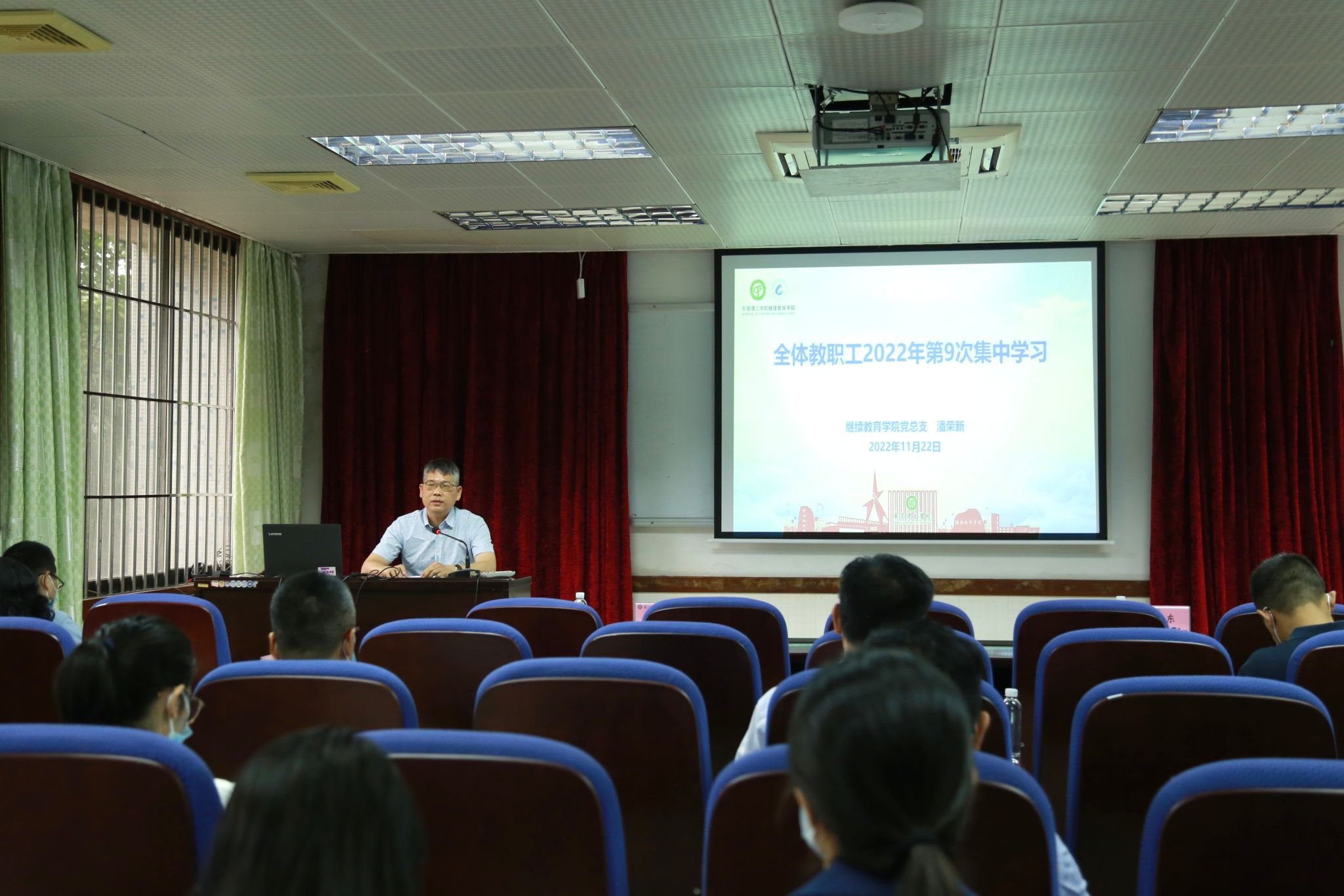 继续教育学院召开全体教职工会议,党总支书记潘荣新、院长刘伟带头宣讲。继续教育学院全体教职工认真聆听了宣讲报告,精神备受鼓舞。