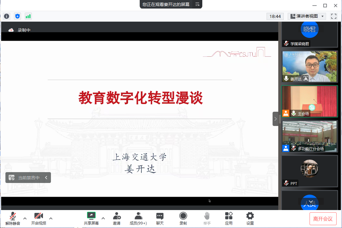 姜开达围绕教育数字化转型这一主题展开漫谈。他对当前我国教育数字化转型的背景、现状、重大意义以及教育信息化建设发展的要点和面临的问题作了全面介绍,并重点讲解了当前网络安全态势下,学校如何在切实保障网络安全的前提下开展教育信息化建设。