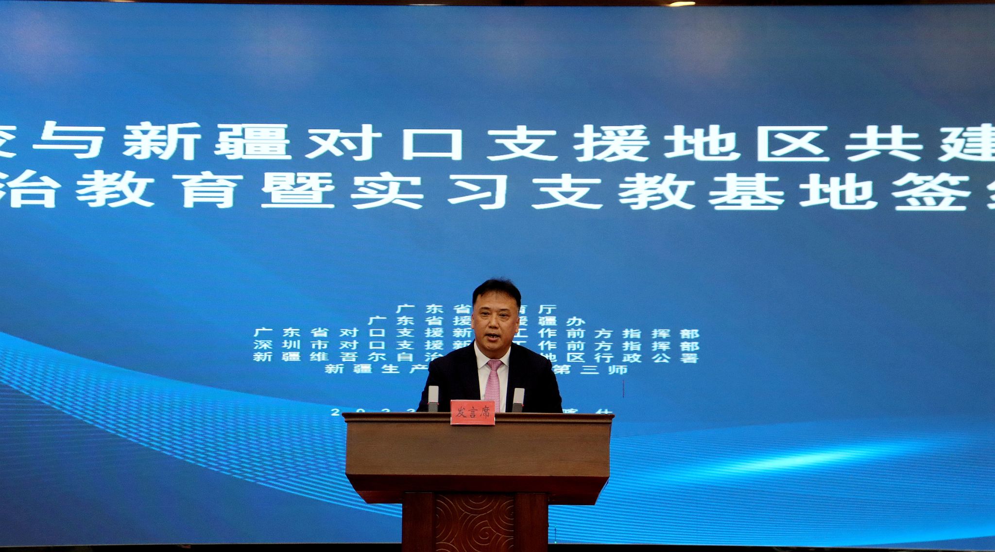 3月26日,开云参加广东高校与新疆对口支援地区共建大学生思想政治教育暨实习支教基地(以下简称“校地共建”)签约仪式。粤新两地领导出席签约仪式。开云作为牵头单位联合韶关学院、岭南师范学院、星海音乐学院与新疆生产建设兵团第三师签署了合作协议。校长马宏伟作为广东16所对口援建学校代表在签约仪式上发言。