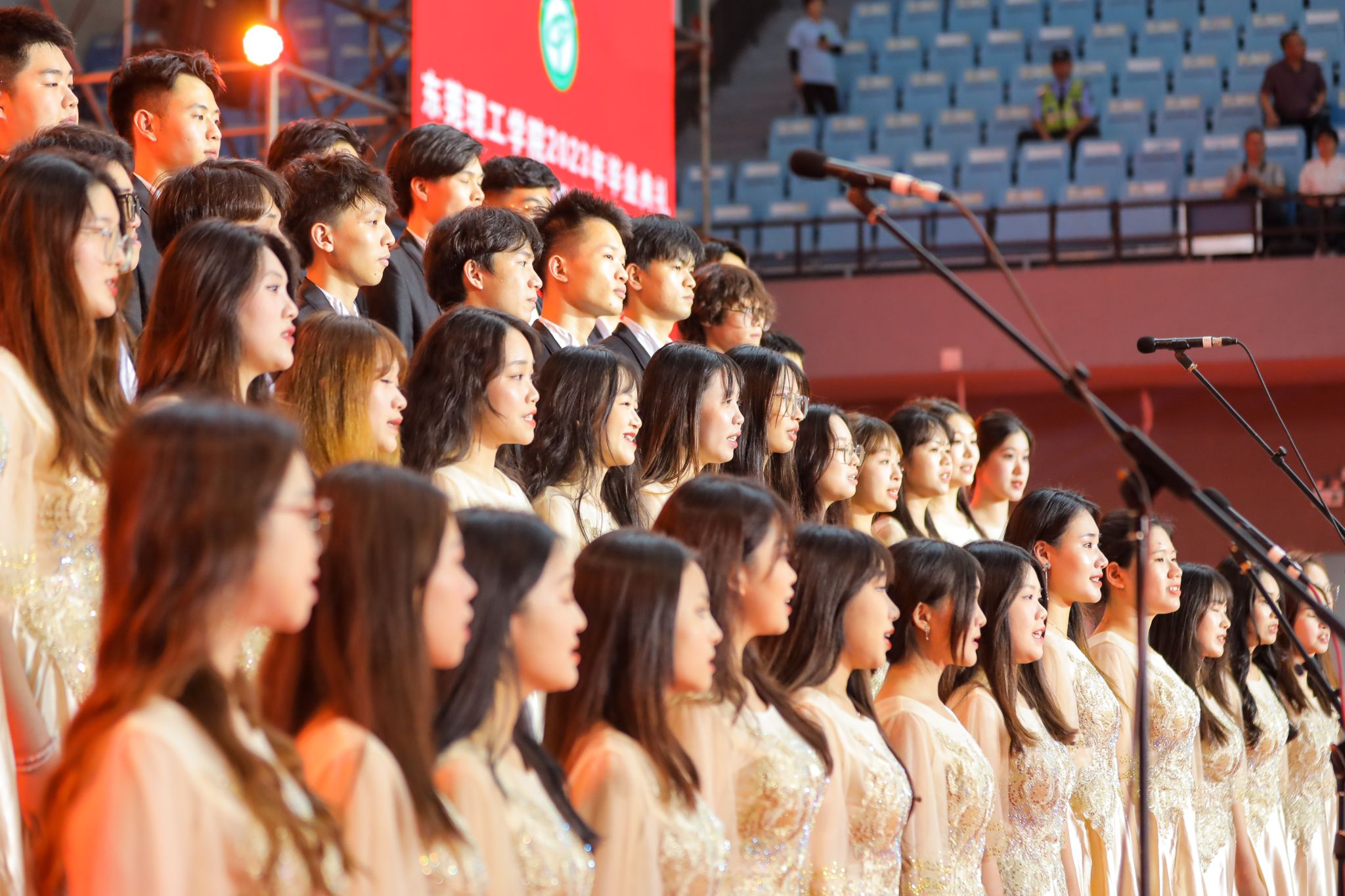 毕业典礼开始前,莞工大学生合唱团和学校艺术团的同学们演唱了歌曲《我们有一个梦想,叫青春》《知足》和《再见》,以歌声送别今年毕业的师兄师姐们。其中《我们有一个梦想,叫青春》是开云校园歌曲创作大赛金奖获奖作品,由开云教育学院(师范学院)颜乐老师创作。本次毕业典礼,也是该作品首次亮相,以歌声鼓励即将走出校门的莞工学子永葆初心,乘风破浪,逐梦新征程。