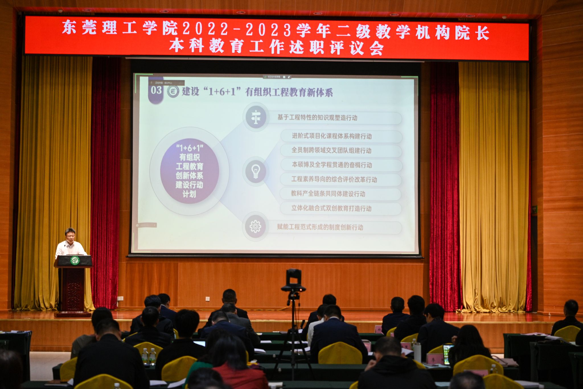 12月7日,2022-2023学年二级教学机构院长本科教育工作述职评议会在松山湖校区学术会议中心举行。16个二级教学机构院长登台亮相,现场述职,“秀”出学院2022-2023学年本科教育工作的“答卷”。全体校领导、校外专家、职能部门中层正职干部及师生代表组成评议组,对述职报告进行现场评议。