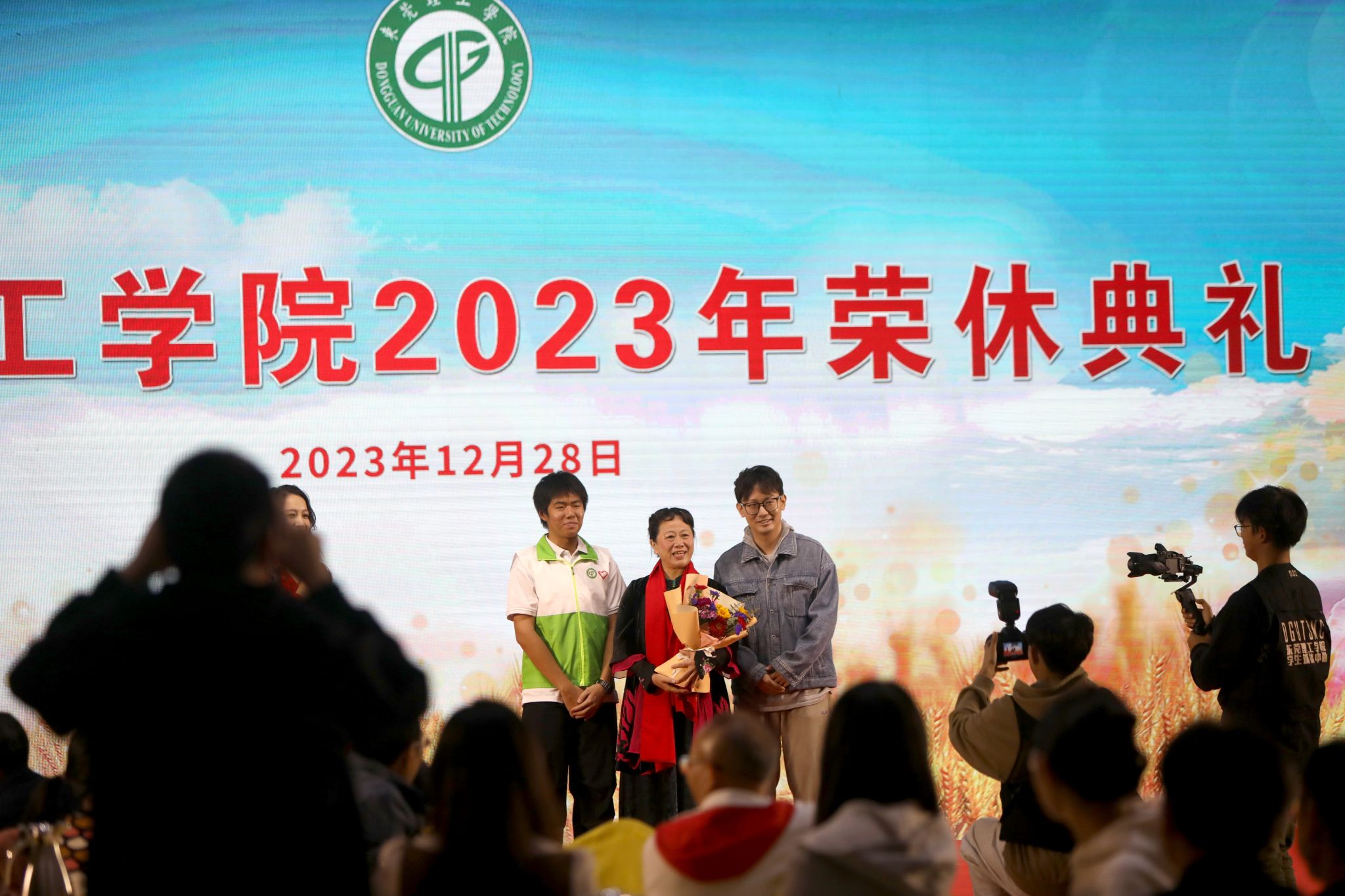 伴着悠扬的旋律,在全场师生的注目下,荣休教职工走过红毯,来到舞台中央。学生代表献上鲜花,青年教职工为荣休教职工戴上红围巾。一束鲜花,代表了莞工师生深深的谢意和无限的敬意;一条红围巾,象征为党育人、为国育才的初心使命在一代代教育者之间传承。