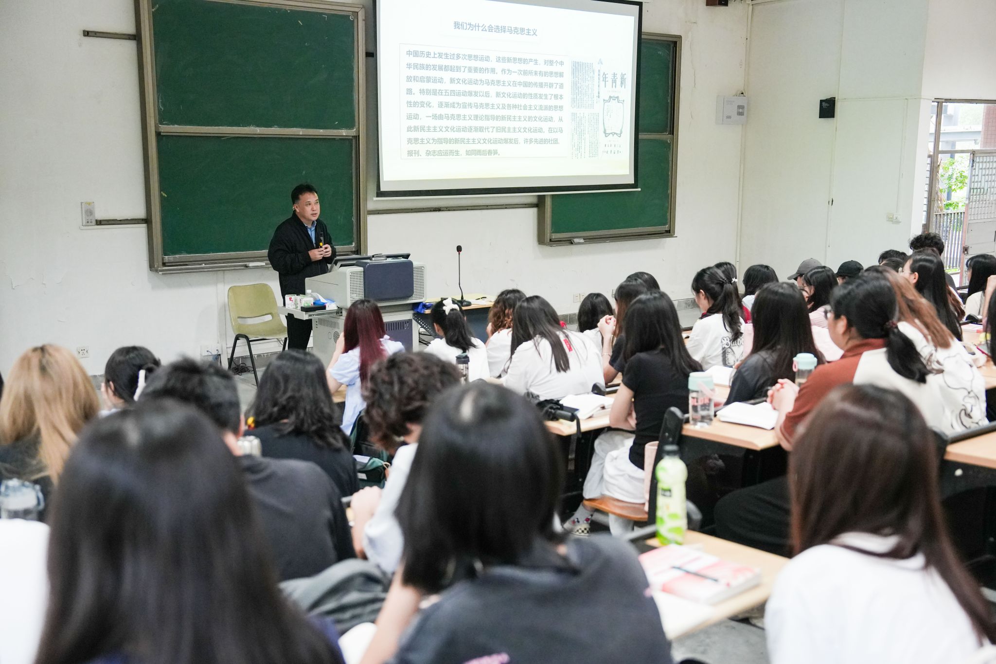 “力有三个要素:大小、方向、作用点,其中方向是最重要的。如果方向错了,越用力越麻烦。而方向就是我们选择的道路。”课堂上,马宏伟从力的方向谈起,引导同学们理解道路的决定性意义。结合党的二十大精神,马宏伟围绕道路决定命运、近代以来中国社会发展的必然选择、我国社会主义建设的两个历史时期三个主题,以丰富的图文史料为同学们深入浅出地介绍了中国共产党是如何在实践中探索,最终形成了中国特色社会主义道路。