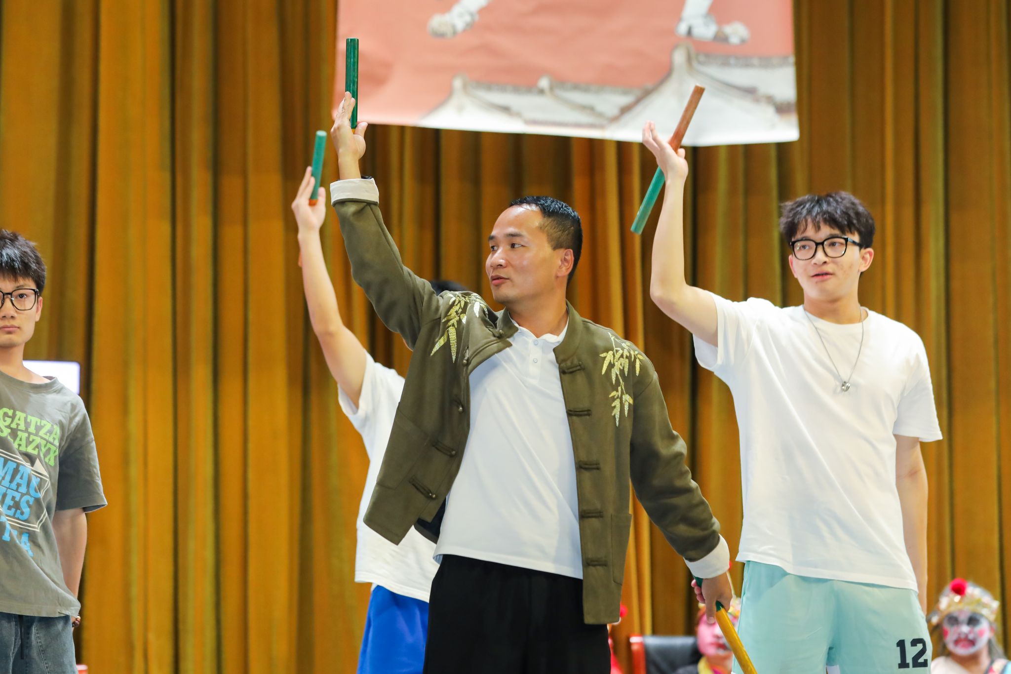 体验教学环节,英歌队员们与同学们热情互动,特别是文化传媒相关专业的同学有意向以英歌为主题开办毕业展,对此,英歌队队员表示十分高兴,并鼓励同学们创作数量更多、形式更丰富的英歌文创产品。