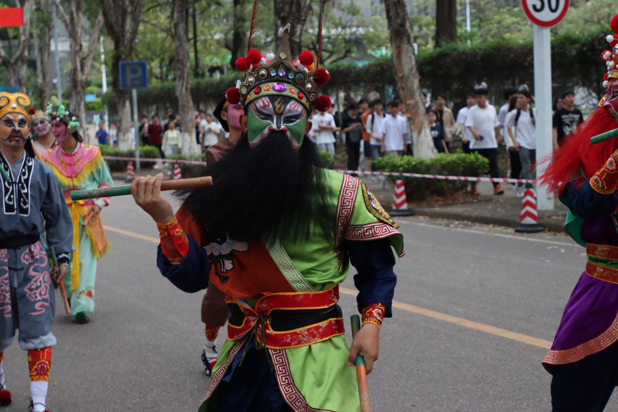 4月10日下午,普宁富美青年英歌队到达莞工的第一站,在笔直的西一路最美校道进行展演。