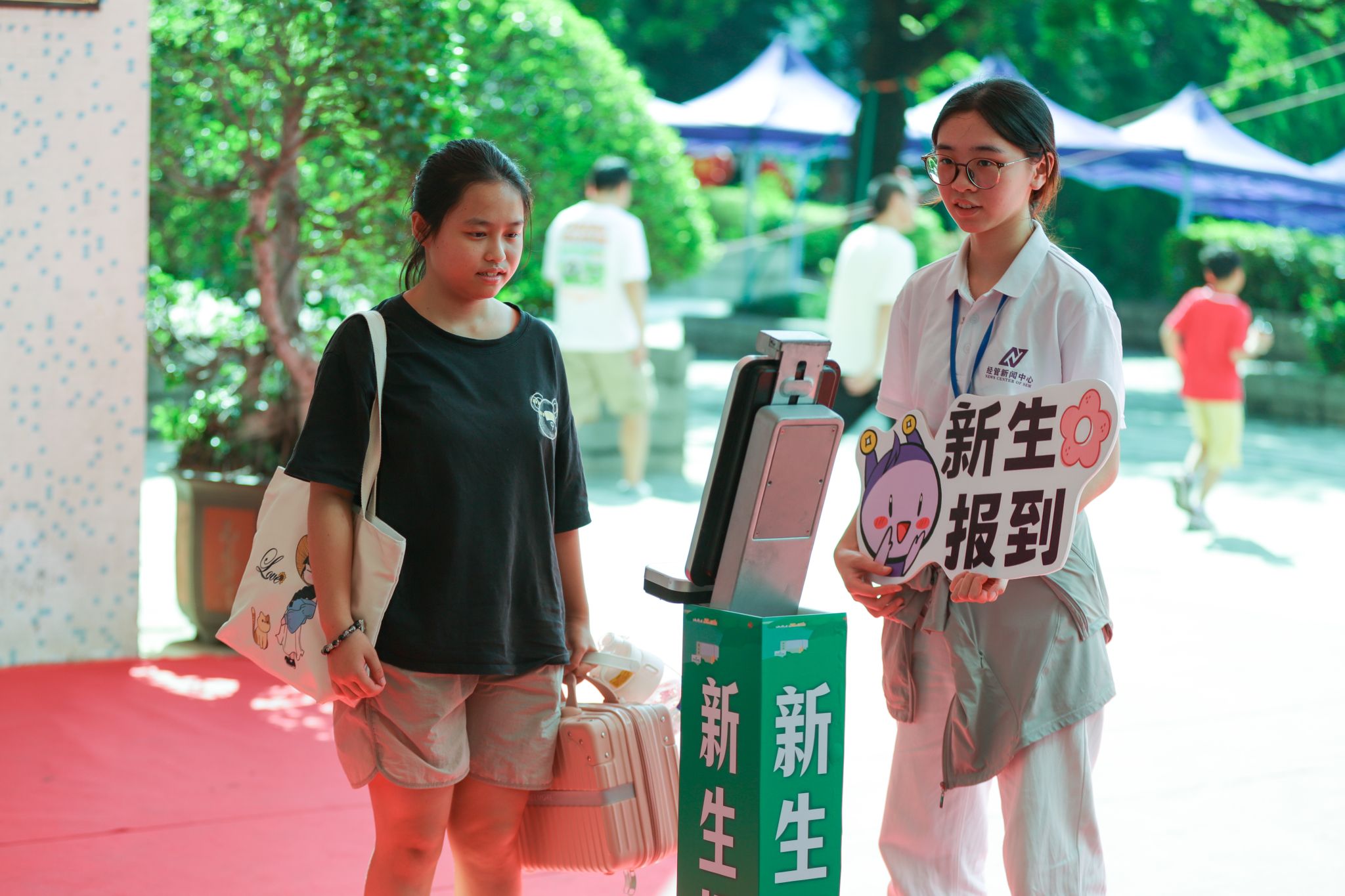 上午9时,随着新生的到来,校园逐渐热闹起来。校道上,身穿各色马甲的志愿者们手持各学院宣传板和迎新标语牌,带着灿烂的微笑,为新生和家长们热心指引。