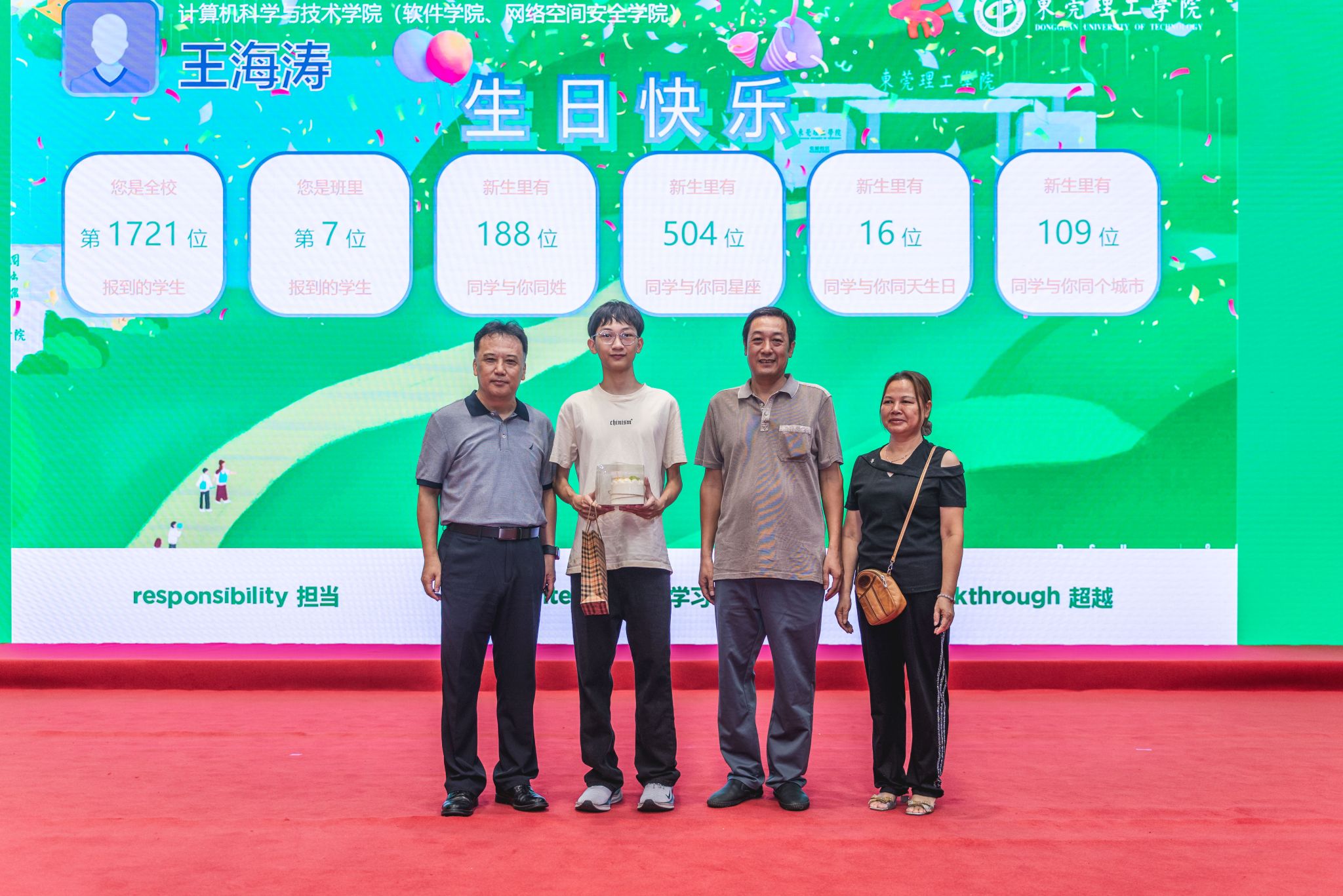 马宏伟还为当天生日的新生代表王海涛送上蛋糕及生日祝福。据了解,今天两校区共有15名新生生日,学校特意为他们准备了蛋糕,寿星们扫脸报到后,大屏幕就会实时出现“生日快乐”四个大字。