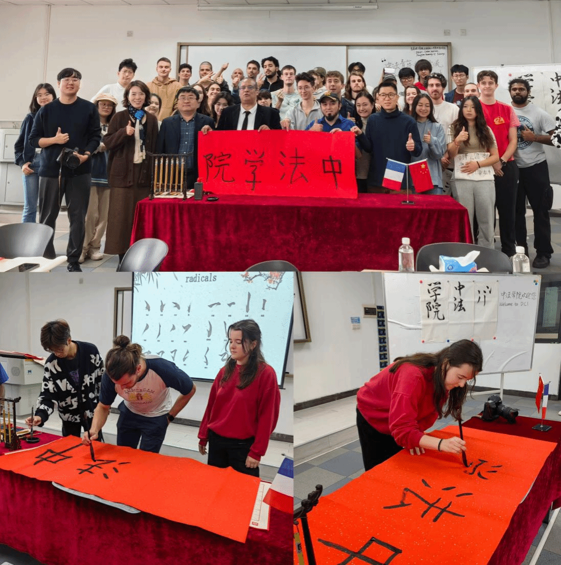 接着,法国工程师学生与中法学院学生共同参与了书法活动。中法学院的学生献上古筝弹奏和中国舞蹈作为活动的开场秀,彰显了中国传统艺术的独特魅力。学生们在活动中学习写汉字,通过书法的学习和实践,他们体会到中国艺术的美妙。双方以笔会友,快乐融洽。