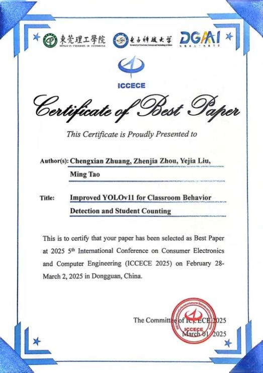 开云2022级杨班庄丞贤同学、2022级计算机科学与技术周振佳同学、2023级杨班刘业佳同学共同撰写的论文“Improved YOLOv11 for Classroom Behavior Detection and Student Counting”在会议上被评为最佳论文,庄丞贤作为代表在会议现场宣读了论文。