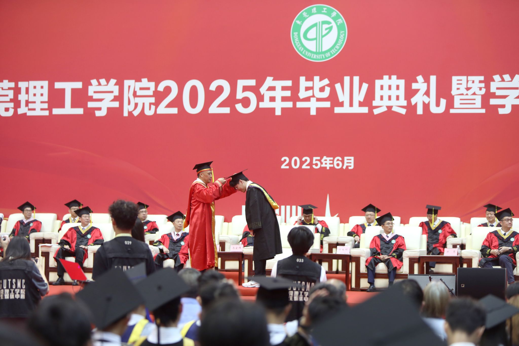上午9:30,松山湖校区体育馆内响起庄严的国歌,毕业典礼暨学位授予仪式正式开始。今年,学校共有4624名本科生、268名硕士研究生圆满完成学业,从莞工扬帆,向未来出发。校党委副书记、校长马宏伟为毕业生代表颁发毕业证书,扶正流苏,并为同学们送上最后的叮咛与祝福。