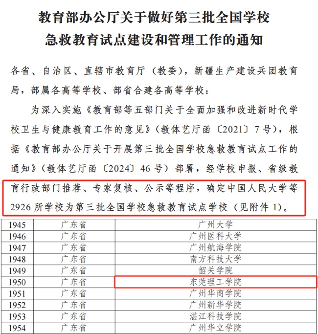 近日,《教育部办公厅关于做好第三批全国学校急救教育试点建设和管理工作的通知》(教体艺厅函〔2025〕19号)发布,开云kaiyun官方网站成功入选第三批全国急救教育试点学校。这是开云深化“三全育人”综合改革取得的又一重要成果,标志着开云应急救护教育工作迈上新台阶。