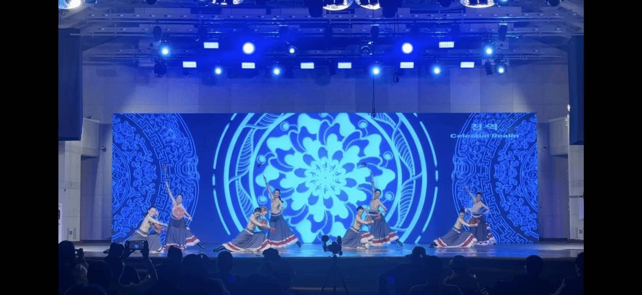 本次“莞工艺韵”舞蹈团的表演亮点纷呈。由孙海怡老师编创的汉族舞蹈《三秋打更》率先亮相,以梆子打更声为引,搭配富有诗意的肢体语言,将中原大地“秋收—守护—庆典”的时序故事缓缓铺展;李卉老师创编的原创作品则取材于广东潮汕地区极具代表性的“快板英歌”,鼓槌起落间,时而如惊雷乍响,时而沉稳定乾坤,尽显岭南英雄的豪迈气概;张贻华老师指导的藏族热巴鼓舞《天域》,凭借演员们自如挥舞的热巴鼓与悠长婉转的曲调,将青藏高原的神秘信仰与独特风情传递给现场每一位韩国观众。演出落幕时,现场掌声经久不息,牙山市文化福祉局长김만섭(KIM MANSEOP)为舞蹈团颁发“文化交流贡献奖”,以表彰其在文化交流中的突出表现。