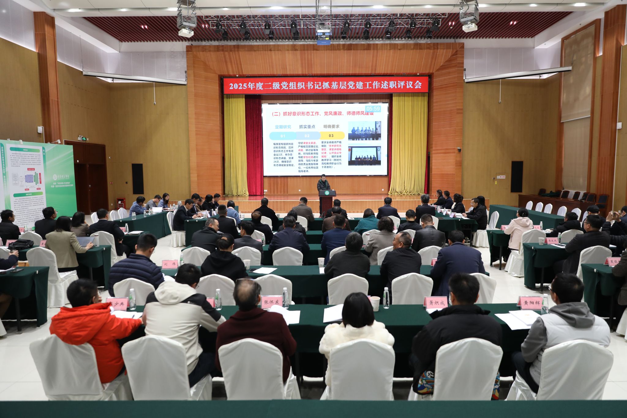 本次述职评议采取书面述职与现场述职各半的方式开展。马克思主义学院党委等12个党组织书记按指定顺序上台进行现场述职,其余11个党组织以书面形式述职。会前,23位二级党组织书记的述职报告及党建工作亮点材料已汇编成册,为参会人员全面了解各单位党建工作提供了参考,评议环节通过线上扫码方式进行,确保评议工作高效有序。