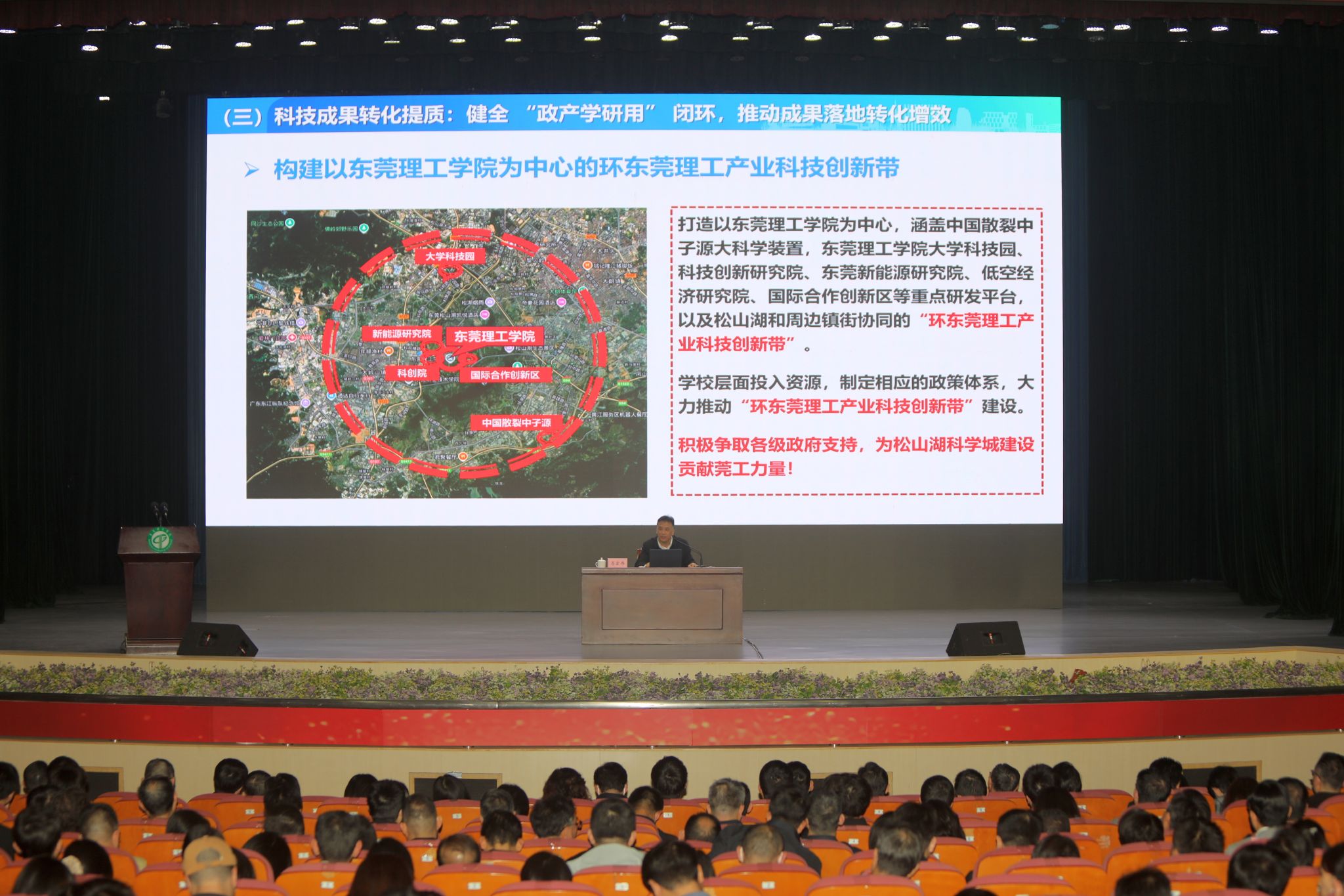 会议全面分析了高等教育综合改革的新形势、新要求,深刻阐释了应用研究型大学的理论内涵与建设逻辑,并立足莞工十年改革经验成果,对把握教育部首批高等教育综合改革试点校重要契机,进一步全面深化综合改革,大力推进高水平应用研究型大学建设作出了重要部署。一是要优化学科体系,主动对接东莞“8+8+4”产业集群,打造急需人才培养新机制。二是创新人才培养模式,深化“三融联动”,构建卓越工程师培养体系。三是要大力促进科技成果转化提质,健全 “政产学研用”闭环,推动成果落地转化增效。四是要构建国际合作生态,夯实国际化办学支撑体系,打造开放合作新格局。五是要推动治理机制改革,强化政策保障赋能,激发内生发展核心动力。