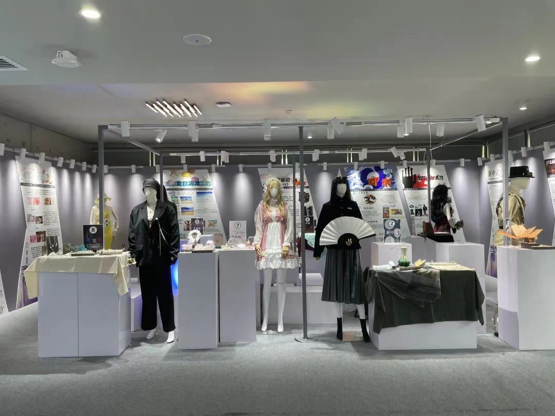 流行配饰作品展厅主要展出的是二年级同学在课程《流行配饰研究》中的成果。谢黎介绍,该课程是基于人们对流行配饰的理解和诠释开展,希望学生在初期接触流行时尚时,能够感受到生活的美好以及对未来进行的展望。现场展品主要由小组作业组成,不同着装主题的人台模型以及各种风格的配饰交织,创造出无与伦比的梦幻舞台。