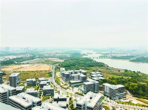从高处俯瞰东莞松山湖,一个个园区鳞次栉比,花草树木环绕四周,碧玉带般的江水染绿了两岸大地,整块区域“绿油油”一片。