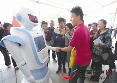 昨日,莞马博览会创意科技展上,一位市民兴奋地与机器人握手对话。东莞时报记者 陈栋 摄